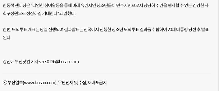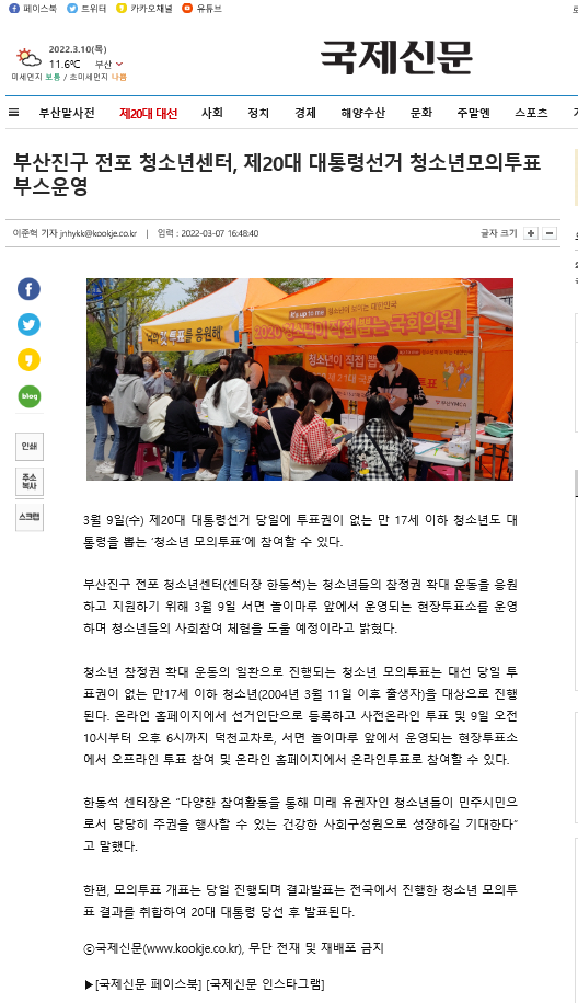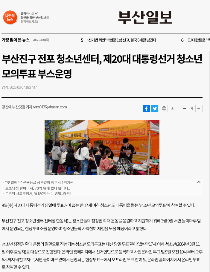 [언론보도]부산진구 전포 청소년센터, 제20대 대통령선거 청소년모의투표 부스운영